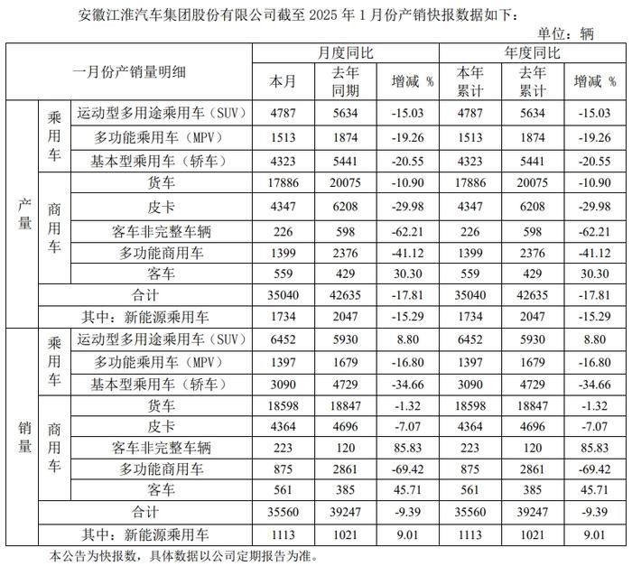 一个是,1月江淮汽车销量约3.56万辆,同比下降9.39%。拉长时间看,江淮汽车已是连续四个月销量同比下滑。尽管公司积极布局新能源领域,但目前转型成效甚微;