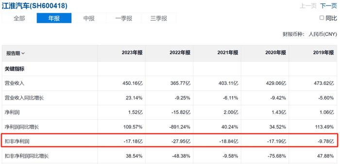 拉长时间来看,江淮汽车此前扣非后净利润已连续七年为负。